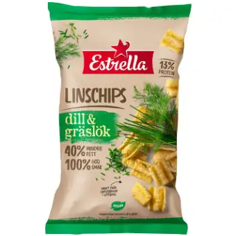 Estrella Leinsamenchips Dill & Schnittlauch ist einer der beliebtesten Leinsamenchips Schwedens im sommerlichen Geschmack von Dill und Schnittlauch. Diese Kräuter mit ihrem brillanten Geschmack passen perfekt auf den knusprig-leichten Linsenboden, der die Geschmacksknospen zum Knallen bringt. Mit 40 % weniger Fett als normale Chips und 13 % Protein sind Flachschips einfach jeden Tag oder am Wochenende zu genießen, mit oder ohne Dip. Außerdem vegan und ohne Gluten hergestellt, damit mehr Menschen es genießen können.