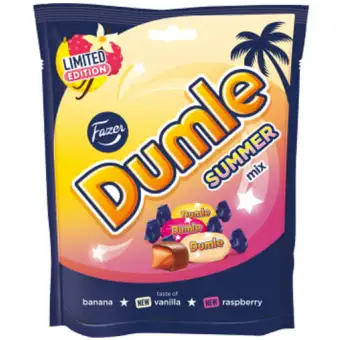 Dumle ist ein schöner Klassiker von Fazer, den fast jeder kennt. Jetzt gibt es ihn als sommerlichen Mix-Beutel für einen vorübergehenden Besuch. Dumle Summer Mix ist eine sommerliche Dumle-Schokolade umhüllt von samtiger Milchschokolade in einer Mischung aus köstlichen Himbeer-, Bananen- und Vanillearomen. Beliebt bei Kindern und Erwachsenen und wie immer aus verantwortungsvoll angebautem Kakao hergestellt.