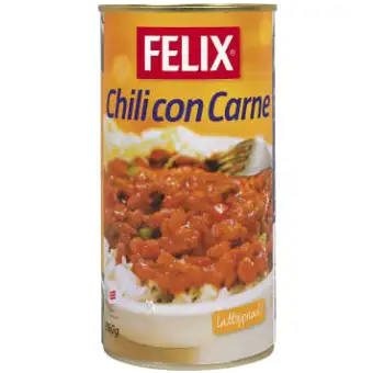 Felix Chili con Carne ist ein reichhaltiger und würziger Eintopf in einem leicht zu öffnenden Glas und kann sofort erhitzt und serviert werden. Das Chili con Carne wird aus Bohnen, Tomatenpüree, Rindfleisch, Schweinefleisch, Zwiebeln und Paprika hergestellt. Mit Reis und einem knackigen Salat servieren und fertig ist eine einfache und schmackhafte Mahlzeit. Enthält keine Konservierungsstoffe.