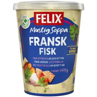 Französische Fischsuppe ist eine schmackhafte und saftige Suppe mit feinen Stücken LACHS und weißem FISCH, frischem KÄSE, einem Spritzer trockenem Weißwein, Pastinaken, Karotten, Sellerie und etwas Petersilie. Erhitzen und direkt aus der Verpackung essen oder in einen Teller gießen und genießen. Passt gut als leichtes Mittagessen bei der Arbeit oder als schnelles Abendessen. in Schweden zubereitet. Gekühlt. 2 – + 8 ° C