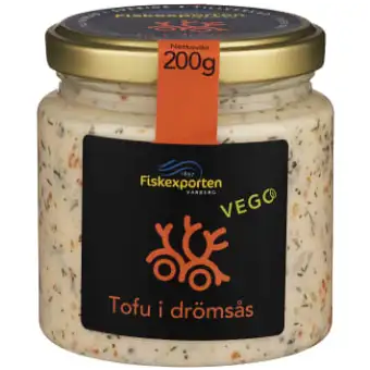 Zutaten: TOFU 45% (SOJA, vatten, Mineralsalz (Magnesiumchlorid)), Wasser, Rapsöl, rot lök, Zucker, Stabilisierungsmittel (acetylerat distärkelsefosfat, Xanthangummi, Guarkernmehl), Algen-KAVIAR mit Algenextrakt, Essig, Tomatenpüree, Modifiziert Stärke, Essig, Dill, Salz, SENFSAMEN, Kräuter, Zwiebel, Säure (Milchsäure, Zitronensäure), Konservierungsmittel (Kaliumsorbat, Natriumbensoat), Farbstoff (Capsanthin, Beta-Carotin).