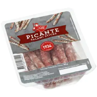 Zutaten: Schweinefleisch, Schweinefett, Geliermittel (E 401), Salz, Zucker, Glukose, Pfeffer, Knoblauch, Aromen, Antioxidationsmittel (E 316), Stabilisator (E 509), Starterkultur, Farbstoff (E 120), Konservierungsmittel (E 250), Oberflächenkultur. Für 100 g verzehrfertiges Produkt wurden 155 g Schweinefleisch verwendet.