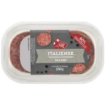 Zutaten: Schweinefleisch, Rindfleisch, fettes Schweinefleisch, Speisesalz, Glukosesirup, Gewürze, Dextrose, Hefeextrakt, Knoblauchpulver, Antioxidationsmittel (E 301), Gewürzextrakt, Konservierungsstoff (E 250). Für 100 g Fertigprodukt wurden 64 g Schweinefleisch und 51 g Rindfleisch verwendet. Wärmebehandelt, geräuchert und getrocknet.