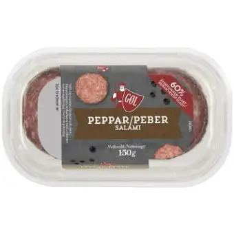Zutaten: Griskött, Salz, kryddor auf ytan (geschrotet Schwarzer Pfeffer, Gelatine), Fett Schweinespeck, Traubenzucker, Kräuter, Knoblauch, ANTIOXIDATIONSMITTEL (E 300, E 301), getrocknete Gemüse, hydrolysiert Mais- och rapsprotein, Kräuterextrakt, Hefeextrakt, Starterkulturen, Konservierungsmittel (E 250). zu 100 g Fertigfabrikat har wird verwendet 116 g Schweinefleisch. geräuchert und getrocknet.