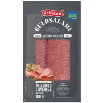 Zutaten: Schweinefleisch*, späck*, Rindfleisch*, Salz, Gewürzmischung (Kartoffelstärke, Kräuterextrakt), Knoblauch, startkultur und Konservierungsmittel Natriumnitrit. *Ursprung: Schweden. Fleischgehalt: zu 100 g fertig Ware har Die wird verwendet 127 g FLEISCH.