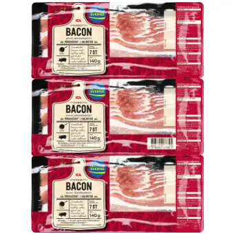 ICA Bacon ist ein schmackhafter und über Buche geräucherter Speck mit deutlicher Salzigkeit, der in Halmstad auf schwedischem Fleisch hergestellt wird. Er passt morgens zum Rührei, zum Brunch zu den American Pancakes und abends in die Nudelsoße. Sie können es auch knusprig braten und über den Salat streuen, um ein wenig mehr Knusprigkeit und Geschmack zu erhalten. In einer heißen Pfanne von jeder Seite ein paar Minuten anbraten und auf etwas Küchenpapier abtropfen lassen.