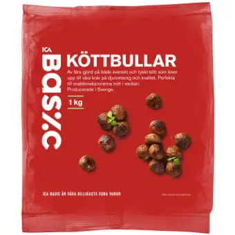 Zutaten: Gris*- och Rindfleisch** 63%, Kartoffel, Wasser, Kartoffelmehl, Kartoffelflocken, Joderat (Nitritpökelsalz) Salz, Traubenzucker, animaliskt Protein von Schwein, Zwiebel, Kartoffelfasern, Pfefferextrakt, Schwarzer Pfeffer. Frittierte i tierisch Fett. *Fött, uppfött och slaktat i Schweden. **Geboren, gezüchtet und geschlachtet i Deutschland.