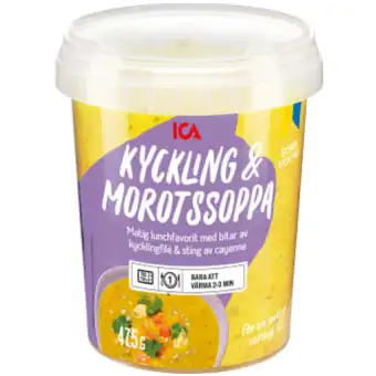 Zutaten Vatten, Karotte 24%, kokosgrädde (kokosextrakt, Wasser), kycklingfilé* 7%, Zwiebel, SELLERIE, apelsinkoncentrat, rote Linsen, Rapsöl, Hühnerbrühe (Hühnerfleisch, kokspad, Meersalz), Knoblauch, Salz, Sonnenblumenkerne, Kräuter (Kurkuma, Ingwer, Koriander, Schwarzer Pfeffer, PETERSILIE, Cayennepfeffer). *Geboren, gezüchtet und slaktad i Schweden.