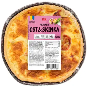 Zutaten: Äggstanning mit potatisflingor 44% (MJÖLK, EI, Kartoffelflocken, Joderat (Nitritpökelsalz) salt, Schwarzer Pfeffer), pajskal 23% (WEIZENmehl, Margarine (pflanzlich Fett (raps, Kokos, ausgehärtet Raps), vatten, salt, Emulgierungsmittel (E471), SÄUREREGULATOR (E330), natürlich Aroma, Farbstoff (E160a)), Wasser, HAFERbrei, Meersalz, MALZMEHL), KÄSE 12% (pasteurisiert MILCH*, salt, Säurekulturen, Lab, konserveringsmedel E202), skinka 8% (Schinken von Schwein**, salt, Stabilisierungsmittel(E451), Kartoffelstärke, Traubenzucker, Kartoffelfasern, Zucker, ANTIOXIDATIONSMITTEL (E301), Konservierungsmittel (E250)), purjolök och paprikamix 8% (Lauch, Páprika), Tomate 6% (körsbärstomat, Salz). *Ursprung Sverige. **Geboren, gezüchtet und slaktad i Schweden.