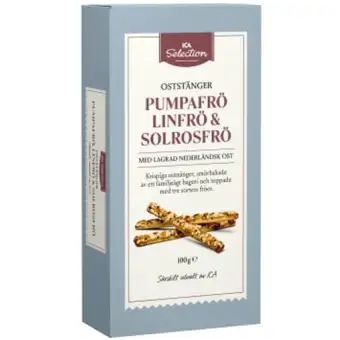 ICA Selection Oststanger mit Kürbiskernen, Sonnenblumenkernen und Leinsamen sind drei knusprige Kekse – in Butter gebacken und mit Käse aromatisiert. Sie passen perfekt zum Käsetablett
