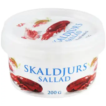 Mayonnaise (rapsolja, Wasser, socker, vinättika, SENF (Senfkernen, socker, Essig, Pfeffer), EIGELB, salt, Stabilisierungsmittel (E415), säureregulierendes Mittel (E330, E296)), SURIMI (zermahlenes Fischfleisch) 11% (Fisch, WEIZENstärke, Zucker, Salz, Rapsöl, EIWEIß, Farbstoff (E120, E160c)), GARNELEN (Pandalus Borealis)/OREGONRÄKA (PANDALUS jordani)* 10%, KREBSSCHWÄNZE 10% (Procambrus Clarkki)**, Dill, Konservierungsmittel (E202, E211). * Fångade i Nordwest- och Nordostatlantik und Stilla Meer, Fanggebiet 21, 27, 67. ** Gefangen i Kina.