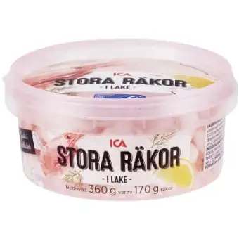 RÄKOR (PANDALUS Borealis), Wasser, Salz, Zucker, Konservierungsmittel (E211, E202), säureregulierendes Mittel (E330). GARNELEN gefangen mit trålar i Nordwestatlantik, Fanggebiet 21. Kan innehålla spår av fisk, blötdjur.