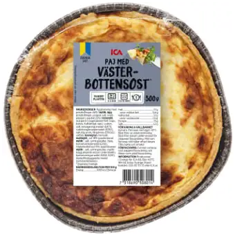 Zutaten Äggstanning mit potatisflingor 44% (MJÖLK, EI, Kartoffelflocken, Joderat (Nitritpökelsalz) salt, Schwarzer Pfeffer), pajskal 23% (WEIZENmehl, Margarine (pflanzlich Fett (raps, Kokos, ausgehärtet Raps), vatten, salt, Emulgierungsmittel (E471), SÄUREREGULATOR (E330), natürlich Aroma, Farbstoff (E160a)), Wasser, HAFERbrei, Meersalz, MALZMEHL), KÄSE 18% (pastöriserad MJÖLK*, salt, syrningskultur, Lab, konserveringsmedel E202), Västerbottenost 15% (pasteurisiert Milch*, Salz, Säurekulturen, MILCH Gerinnungsmittel Enzym (mikrobiotisch), Konservierungsmittel (E202, E251), gegen Klumpenbildung Mittel (Kartoffelstärke)). *Ursprung Schweden.